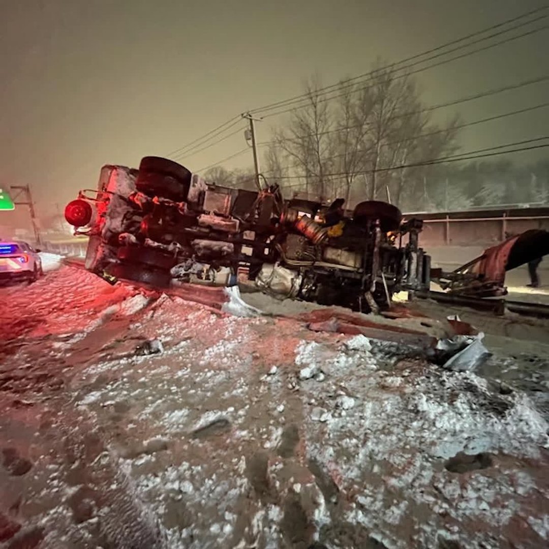 Dept. of Transportation plow truck overturns on Sunrise Highway