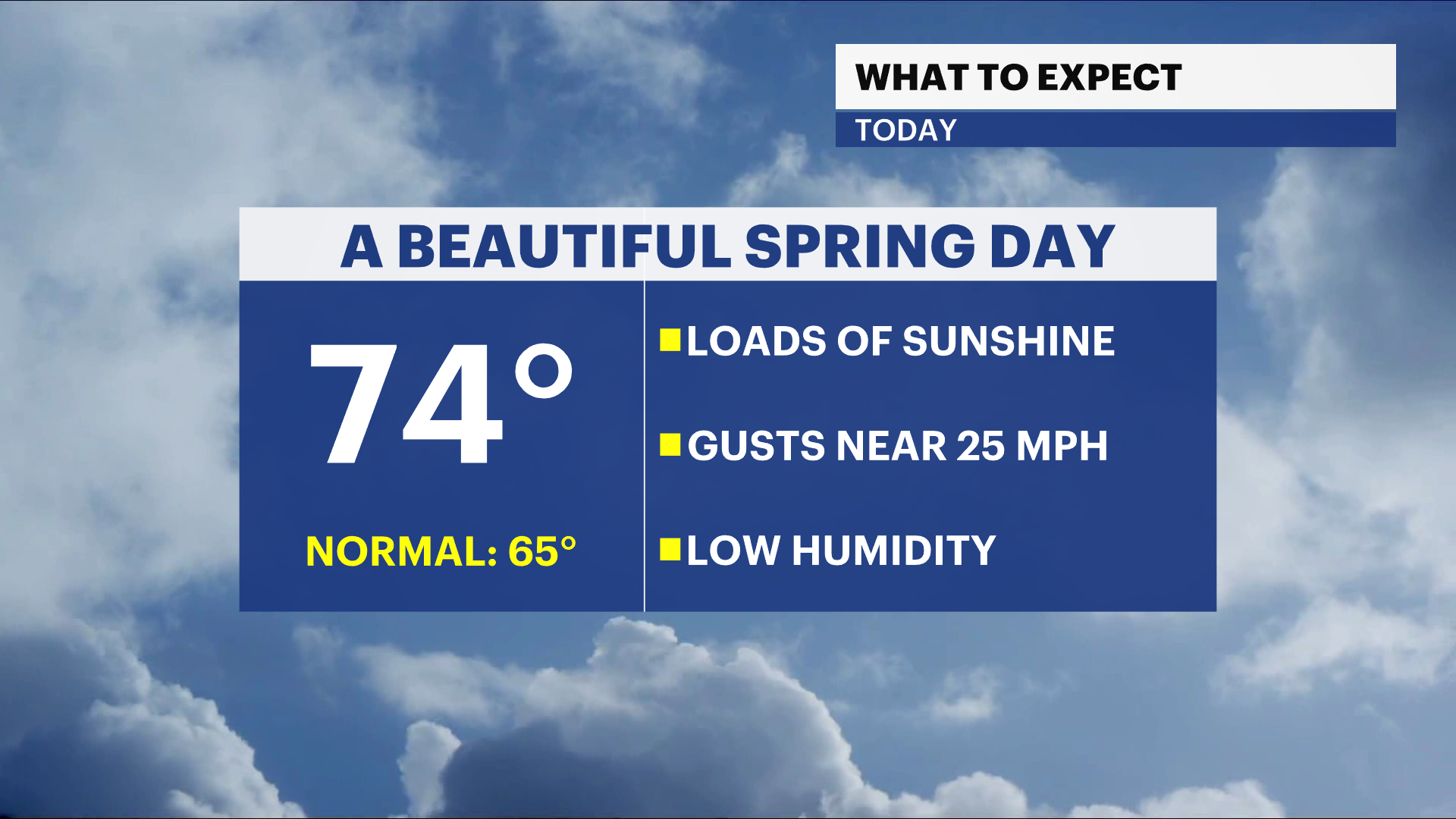 Today will be a beautiful spring day in the city filled with sunshine, milder temperatures in the 70s and a refreshing breeze. Due to the ongoing drought, low humidity, breezy conditions, and plenty of sunshine, there is a low risk for fire danger today. Avoid open flames and discard cigarette buds properly. Friday will be slightly cooler with highs in the low to mid 60s under a partly sunny sky. A stray evening shower is possible.