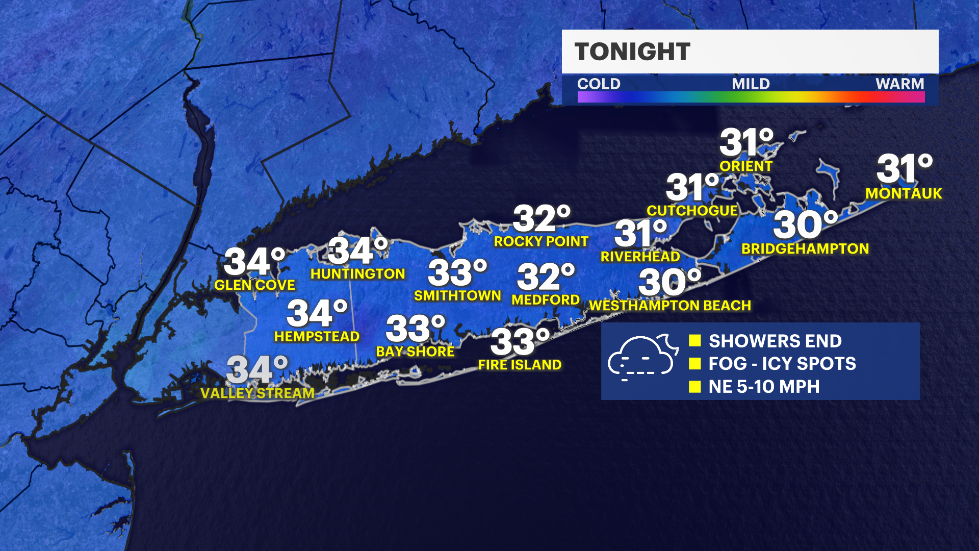 Keep an umbrella with you this evening as light rain and drizzle continue in most areas. Patchy areas of fog continue to reduce visibility at times. Rain showers will mostly taper off before midnight, but watch out for icy spots into Thursday morning as some areas, especially in Suffolk County, can get down to around 32 degrees. This can cause icy spots to develop into the first part of the Thursday morning commute from refreezing of the wet ground from the fog and rain we had today.