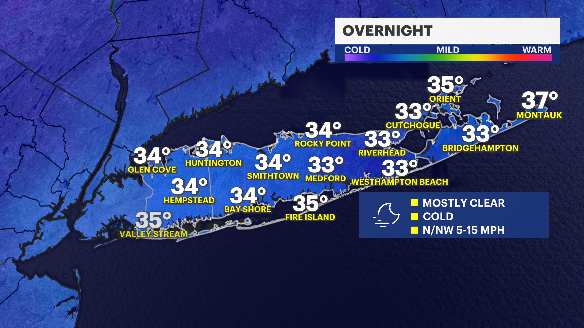 OVERNIGHT: FREEZE WARNING (Suffolk County) -- Mostly clear and cold with lows in the upper 20s to lower 30s. Lows in Nassau County will mostly be a couple of degrees above freezing, but it will be cold with frost all across Long Island into Tuesday morning. Dress warmly!