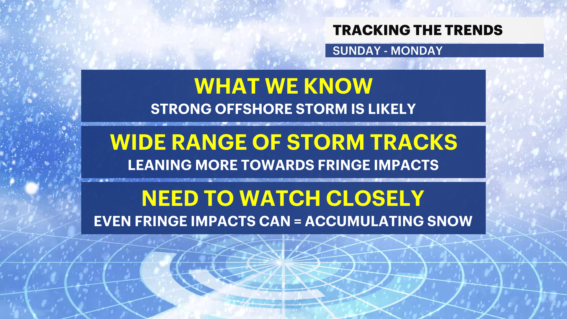 We are watching it very closely for you, and we will have a better idea of the track and if the storm will give us local impacts by Thursday night into Friday morning. If we need to issue a snow map, we will do so by Friday and will provide the latest, most reliable information for you on-air, on social media and on the News 12 app. At this time, we are not forecasting a major storm, but that can change depending on the ultimate storm track and intensity.