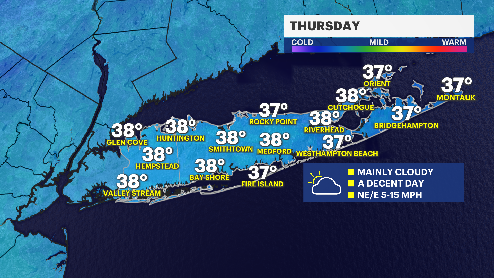 Most of Thursday will be decent, but expect a mostly cloudy day overall with high temperatures around 40 degrees. The best chance for more breaks of sun will be across eastern Suffolk County. Saturday will also end up being a decent day with highs in the low 40s and a mostly cloudy to partly sunny sky.