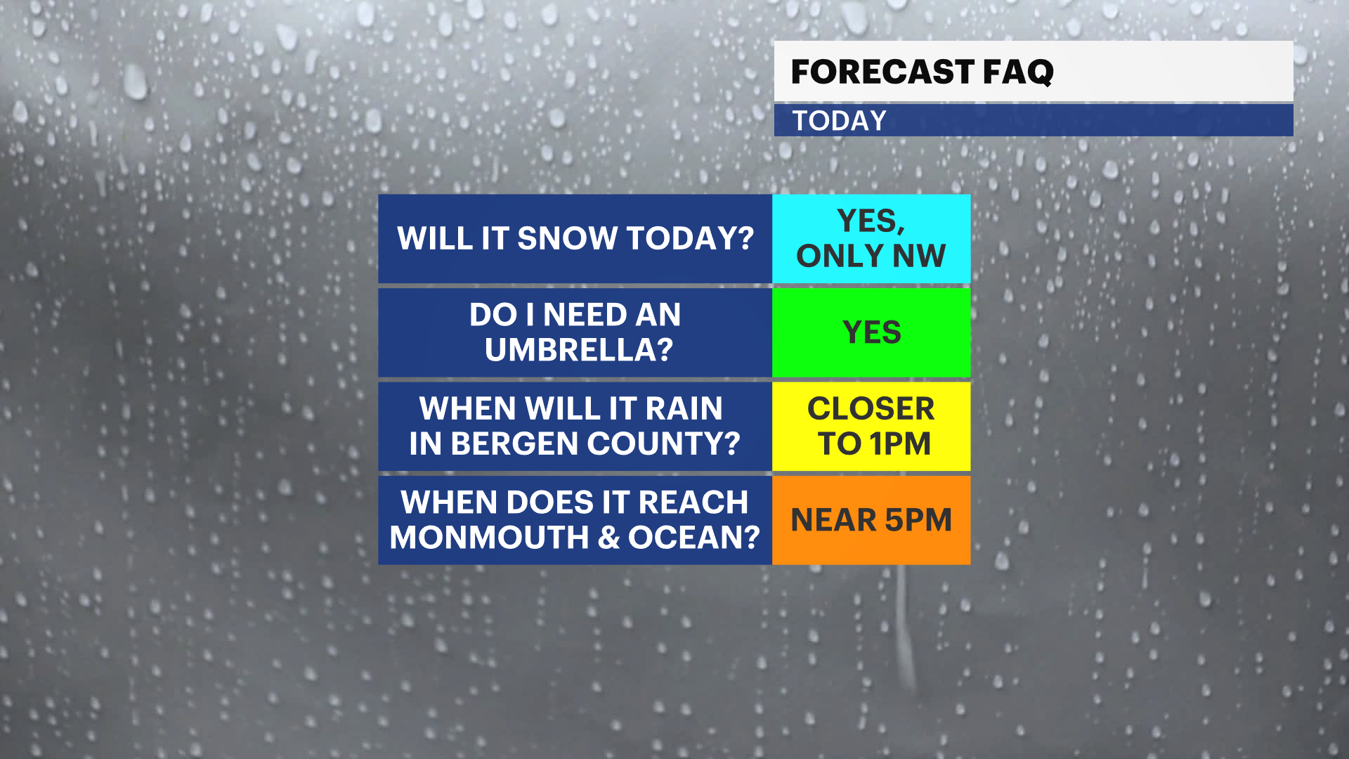 Rain/snow arrives on the western border of the state by noon today, slowly moving eastward, reaching Bergen County by 1 p.m. It takes its time getting to Monmouth & Ocean counties, arriving near 4 p.m. - 5 p.m. as rain. It begins to end north and west near 6 p.m. It ends down the shore by 9 p.m.