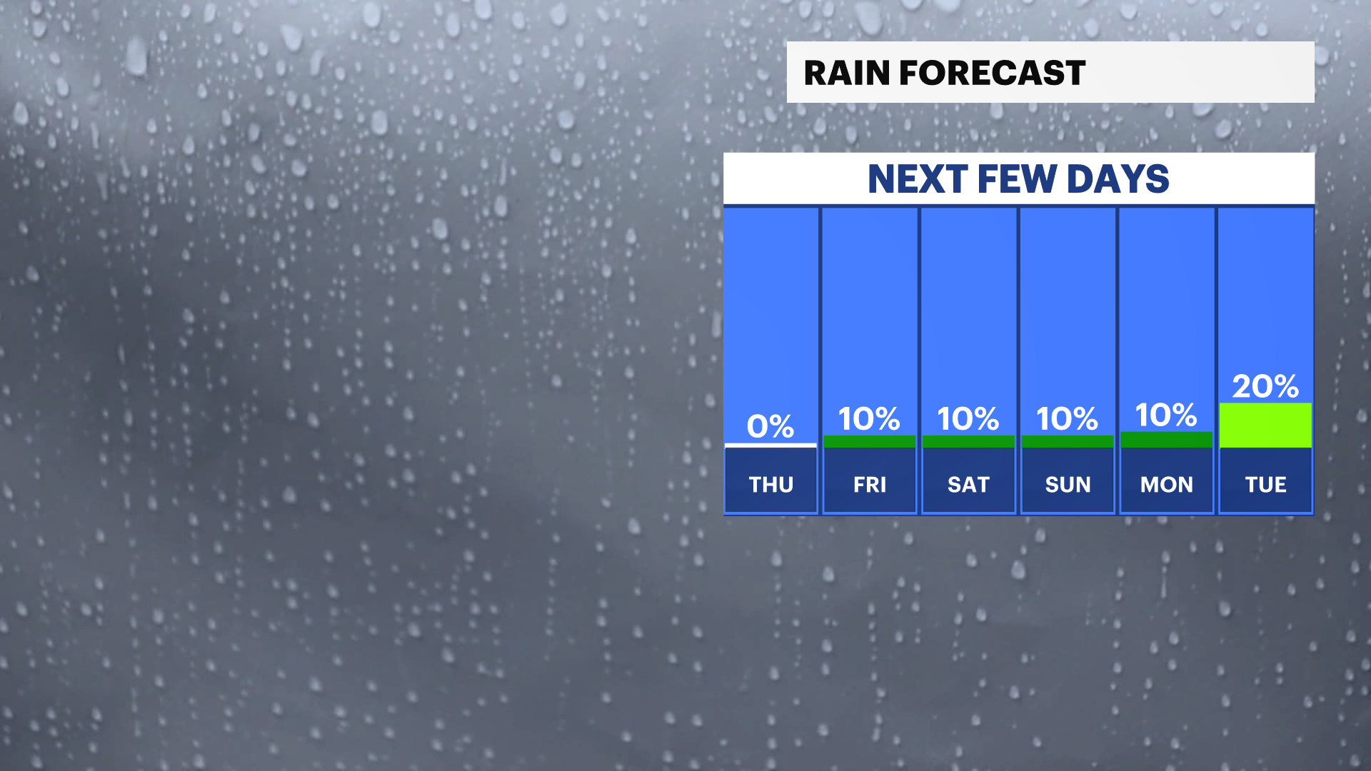 The rain free spree goes on, yet another day. The majority of the next week looks to be exceptionally dry, with no major opportunities for rain any time soon.