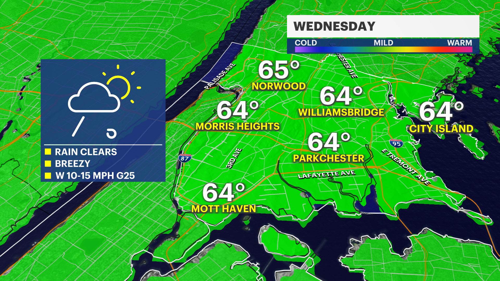 WEDNESDAY: Early morning rain with conditions improving in the weekend. Breezy. Highs in the low 60s, lows in the higher 40s.