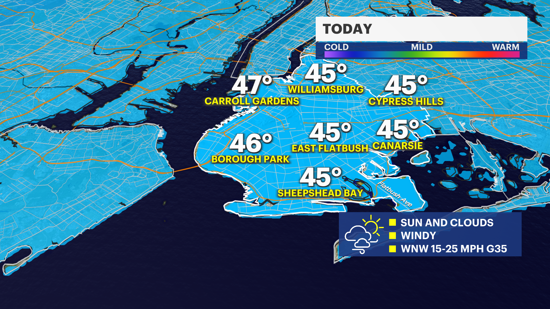 NOW: Breezy conditions will diminish overnight. Temperatures will fall into the 40s and bottom out in the 30s.