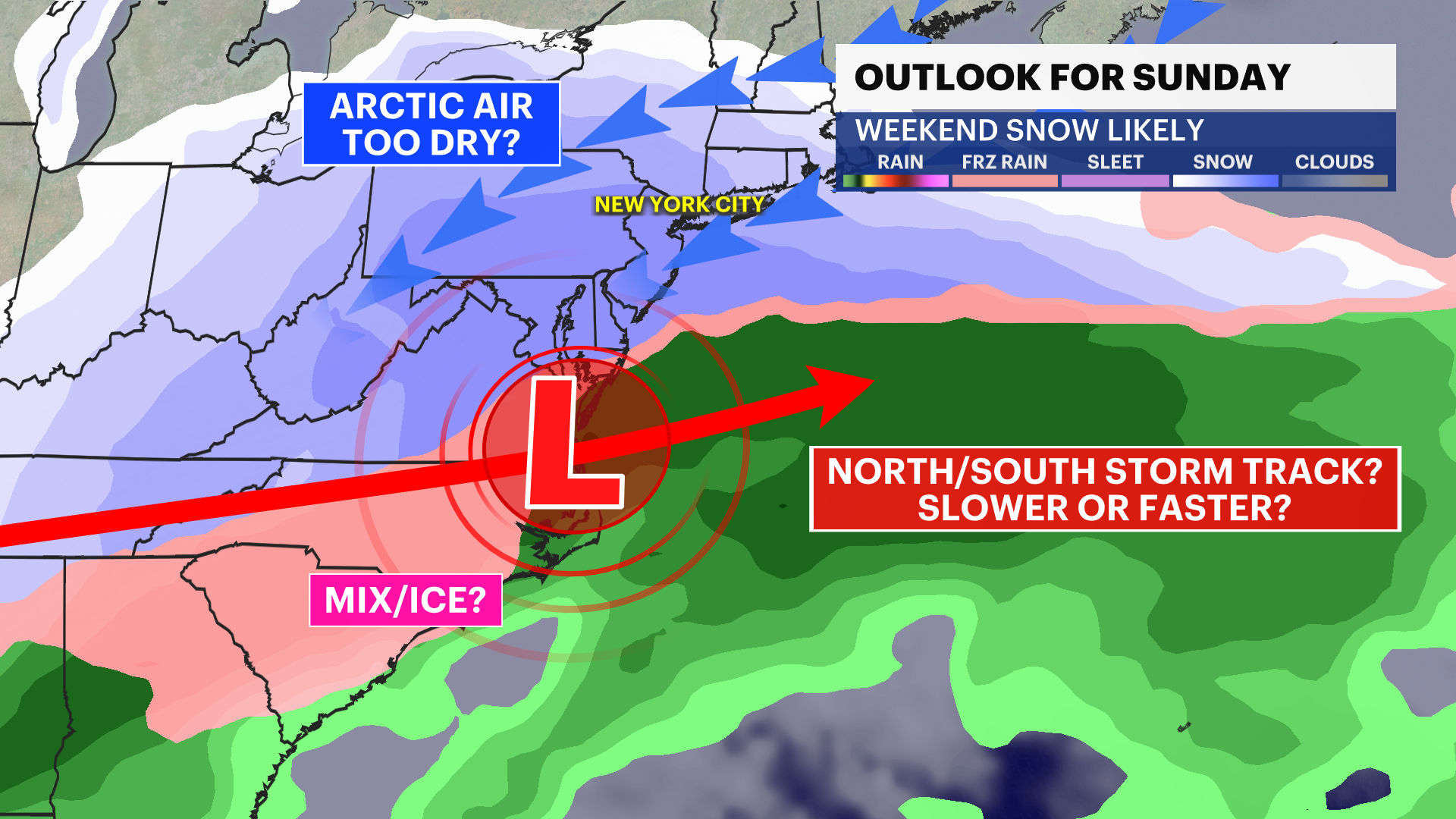A major winter storm is expected to hit New York City by Sunday, bringing with it heavy snow rates, intense amounts of snow, and the potential for ice and freezing rain. How much snow? Depending on how much ice and slush tries to mix in, the News 12 Storm Watch Team is tracking the potential for 6 to 12 inches, potentially more if it stays on the powdery, less icy side. Regardless, anticipate major travel woes, including the likelihood for significant delays or cancellations. This will begin late Saturday night and into Sunday morning, continuing throughout Sunday and into the first half of Monday. Saturday is on the quieter side to allow for preparations. Make sure you are stocked up on salt, know where your shovel is, have a plan for how to stay warm and dry, and be vigilant about charging up devices in case there are power problems Sunday and Monday. Sunday morning the National Weather Service has issued a winter weather watch for accumulating snow from Saturday night through Monday morning that could reach totals of up to a foot. This is still an evolving forecast, keep checking back in with the News 12 Storm Watch Team as it will continue to get new information in.