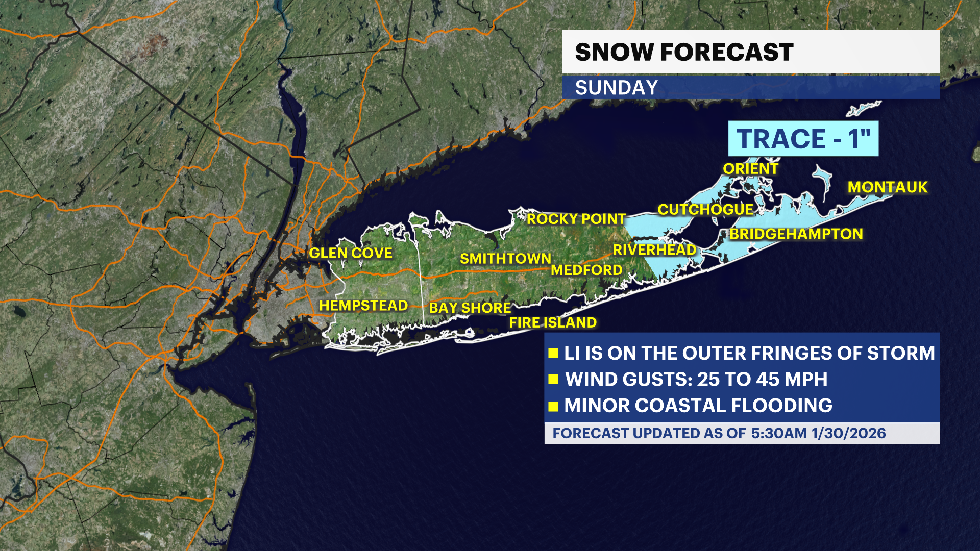 The nearby coastal storm we have been tracking all week still looks like it will not bring accumulating snow to most of Long Island. From Riverhead on east through Montauk and Orient points, there is still the chance for a trace to one inch of snow. Any slight jog west with the storm would change those East End amounts a bit, but we do not expect that to happen at this time.