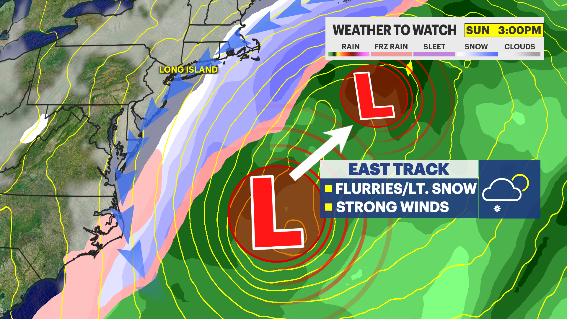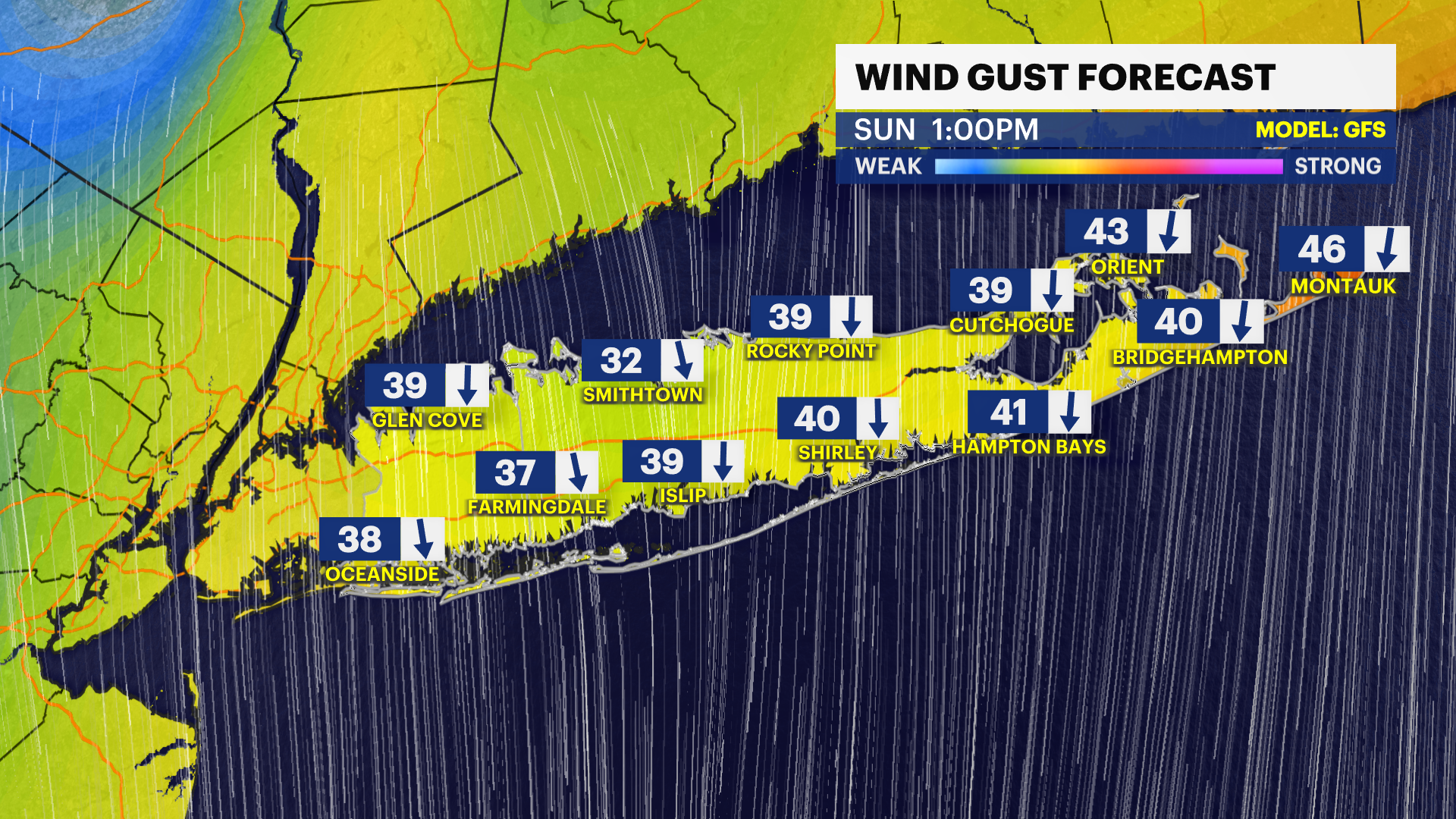 You should expect a mostly cloudy and windy day on Sunday with the chance for flurries, other than areas further east which can have that light accumulation. Wind gusts all across Long Island will be in the 25 to 45 mph range.