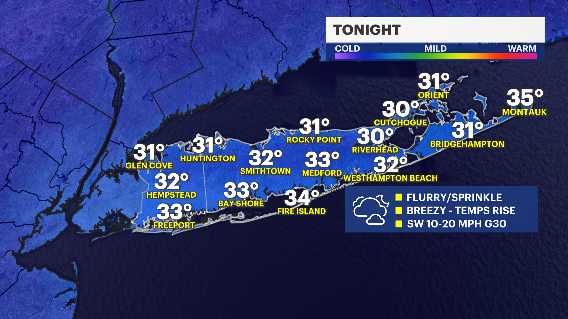Friday: Mostly sunny with a high near 38. Breezy with a west wind 10 to 20 mph with gusts as high as 30 mph. Wind chills in the teens and 20s.