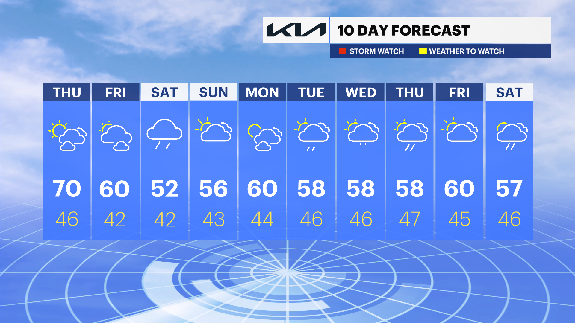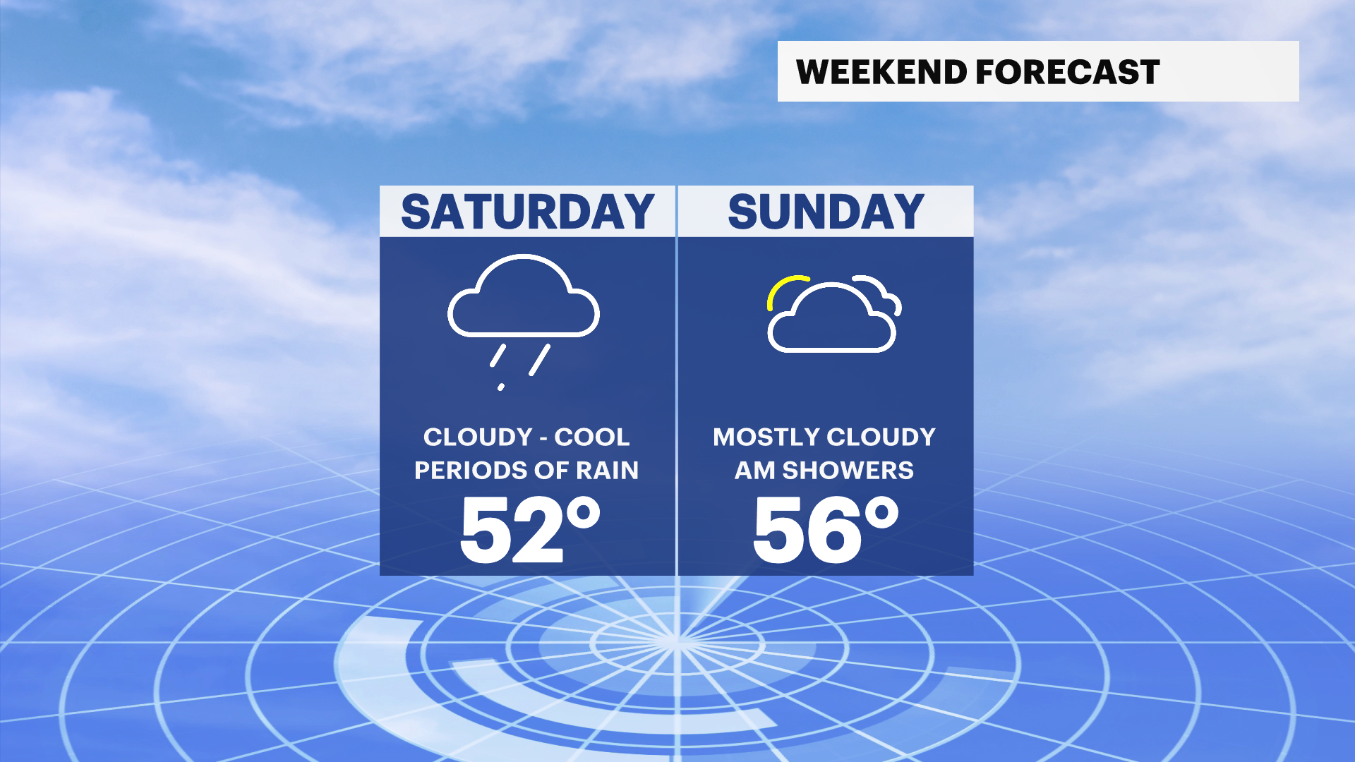 FRIDAY: Morning clouds and an isolated rain shower give way to more afternoon sunshine. Highs around 59 degrees. Lows near 44 degrees.