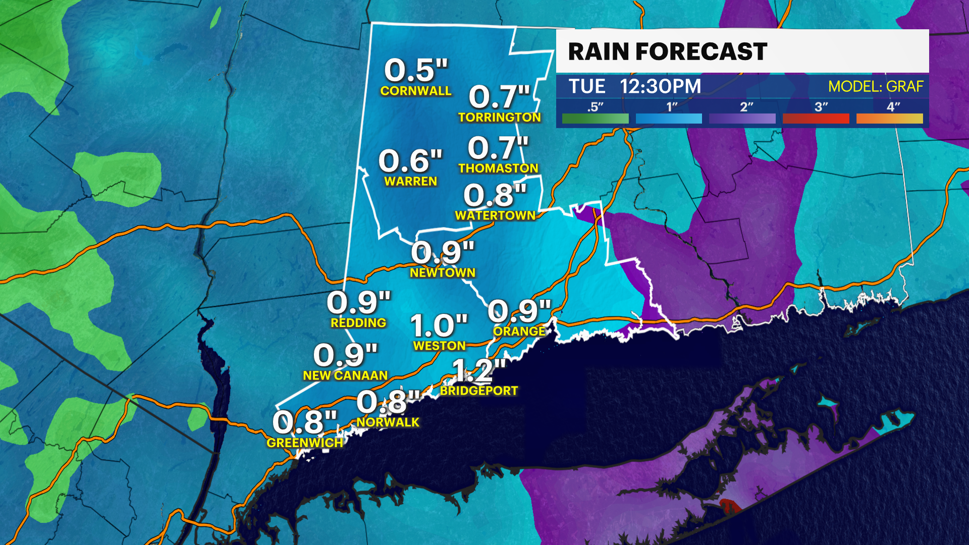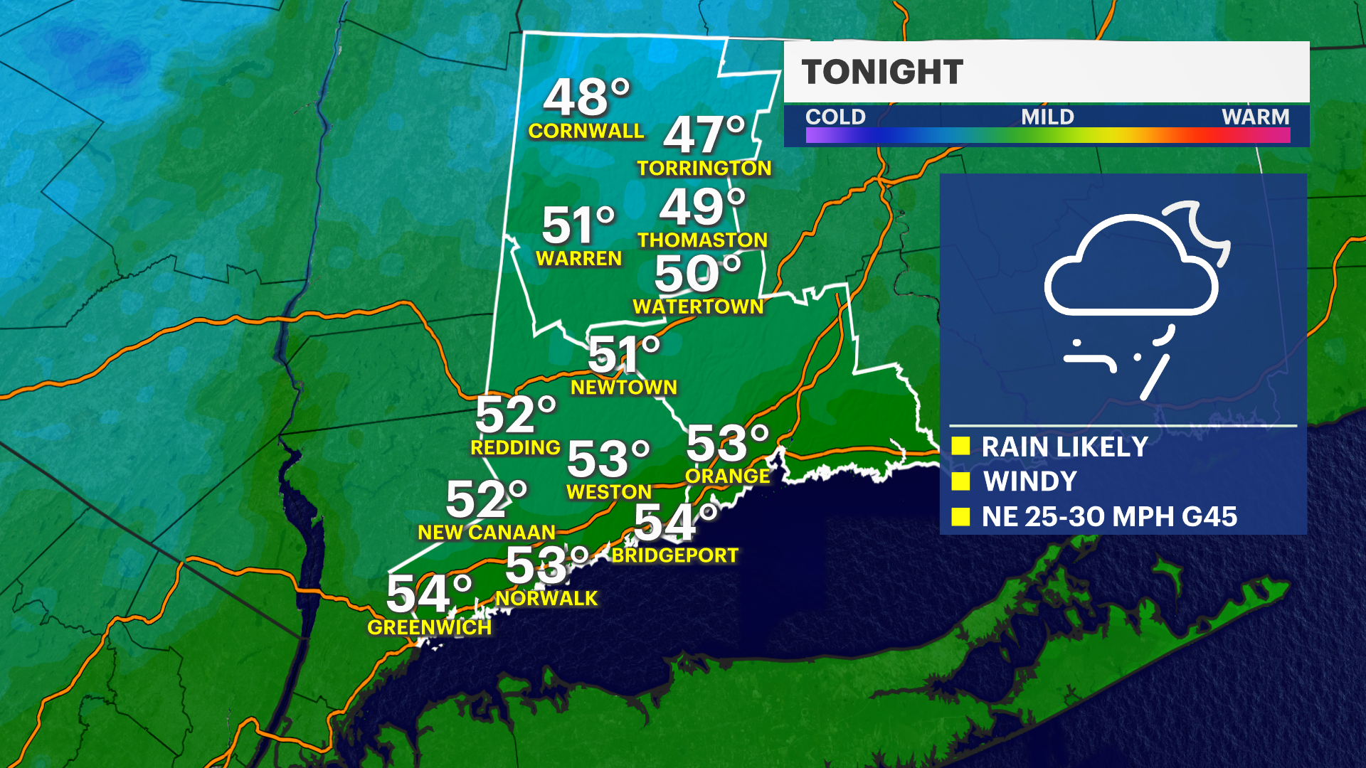 A slow-moving nor'easter will continue to impact western Connecticut, bringing increasing rain and gusty winds to much of the region. The rain turns steadier and heavier, and the wind strengthens even more. Gusts could top 40 mph overnight.