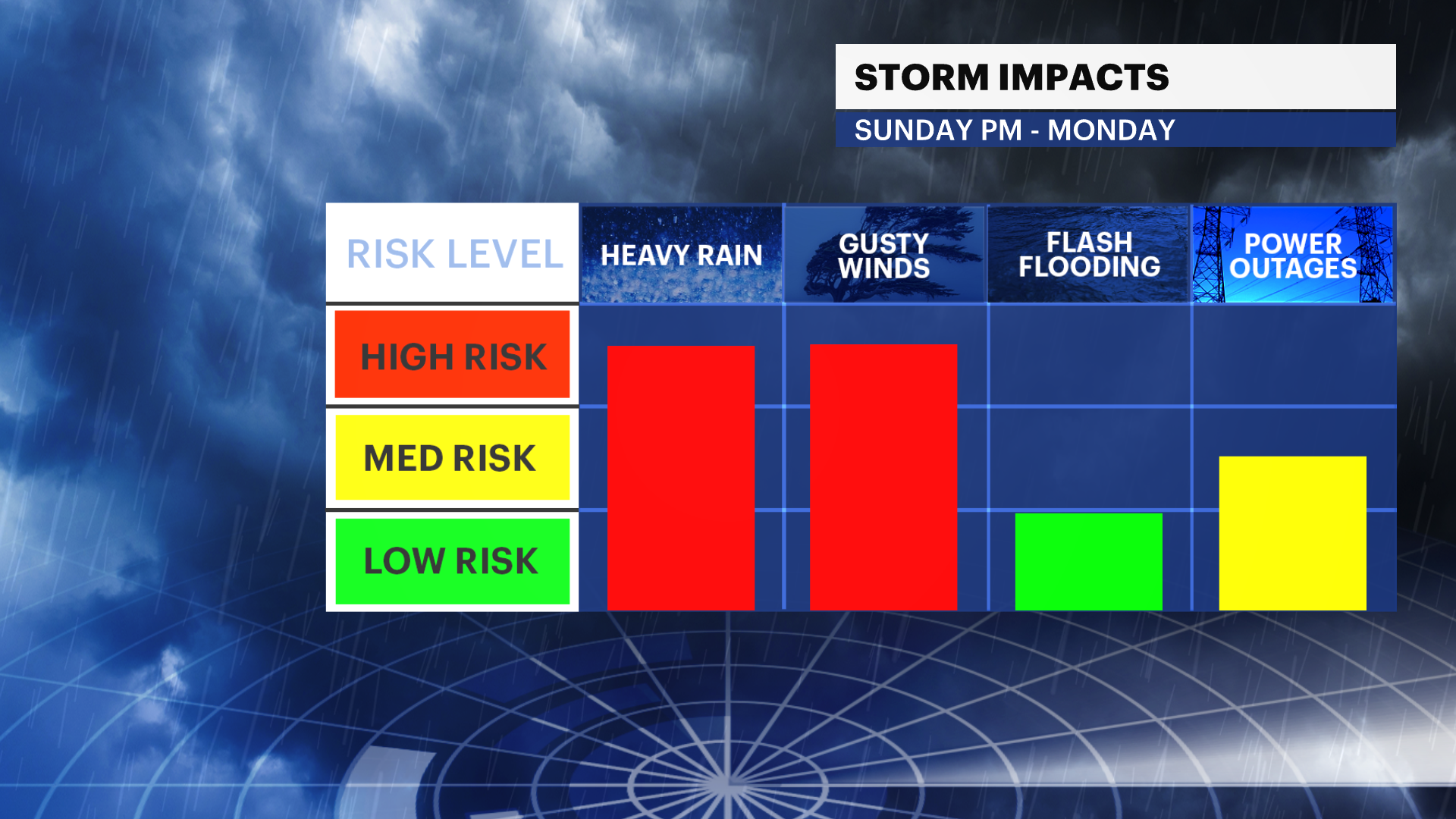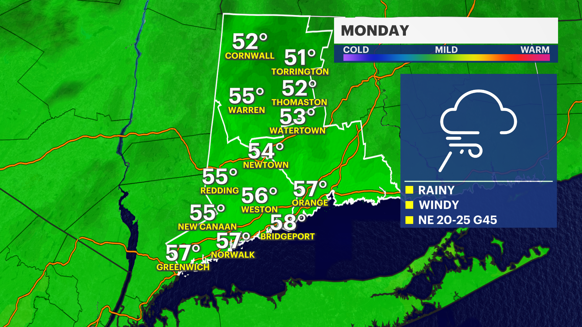 Monday will stay wet and windy, with rain continuing through much of the day and another round of gusts near 45 mph. Temperatures will once again stay in the low 60s. Periods of rain will continue into Monday night before tapering off toward Tuesday morning.