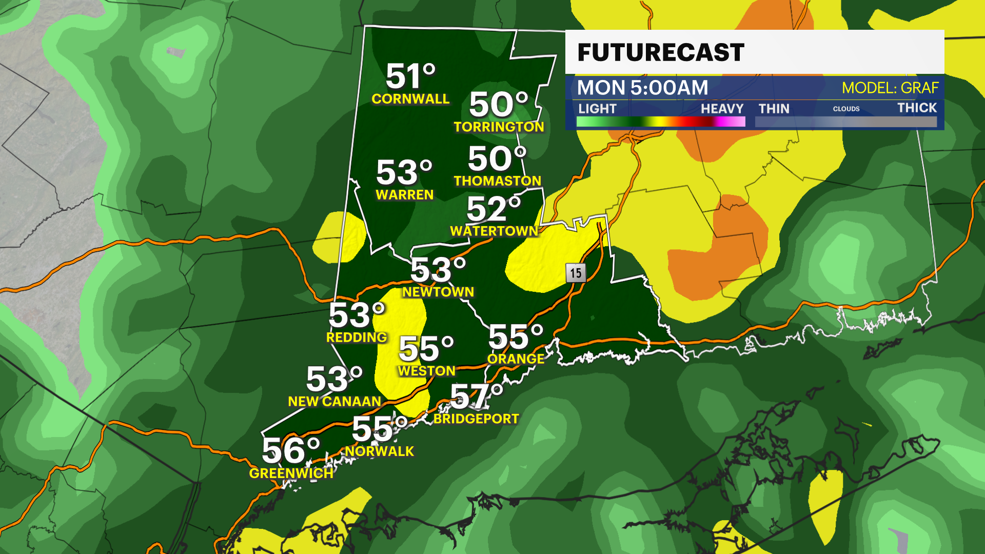 Temperatures will hold near the mid-50s as the storm continues to spin offshore, with a half- to three-quarters of an inch of rain possible by daybreak.