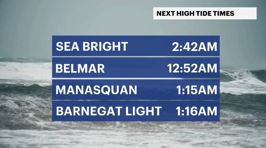 The next high tide along the Jersey shoreline occurs after 1 a.m. and then an hour or two later in the back bays. This will be a significant rise in tidal waters. The next high tide after that will occur around 1:30 p.m. Monday. This is expected to be the biggest and possibly most detrimental.