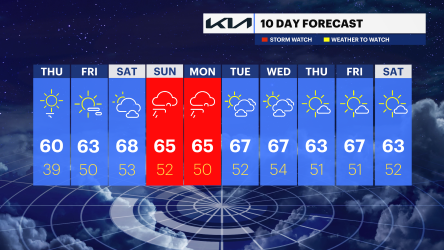 Be prepared for chillier mornings, especially on Friday, and cooler afternoons. High temperatures will stay in the low to mid-60s Thursday and Friday with plenty of sunshine.