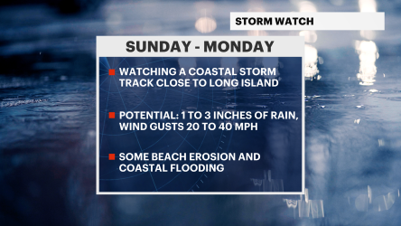 STORM WATCH: The News 12 Storm Watch Team continues to closely monitor the evolution and track of a coastal storm that will be nearby Sunday into Monday. While the exact local impacts of this storm will become clearer over the next couple of days, I would plan on a wet and windy end to the weekend.