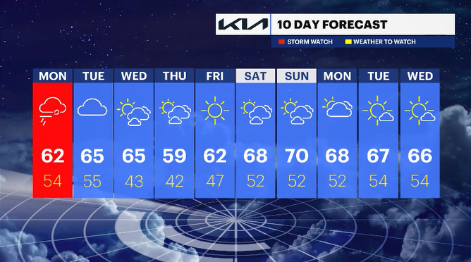 MONDAY: Cloudy, steady rain with the strongest winds in the morning and early afternoon. Rain will begin to taper off in the evening, with winds also starting to weaken. It will be a very cool and soggy day. Highs in the low 60s. Lows in the mid-50s.