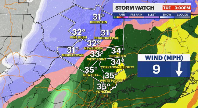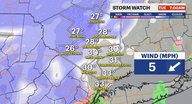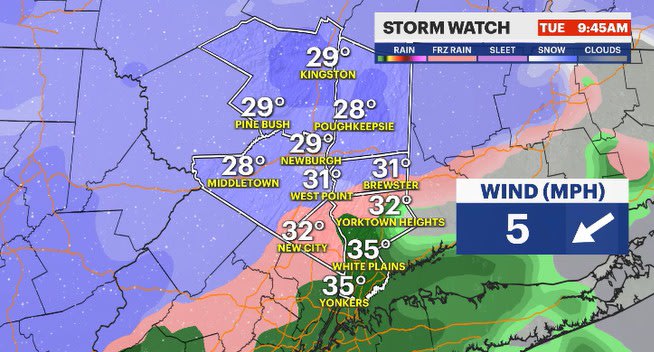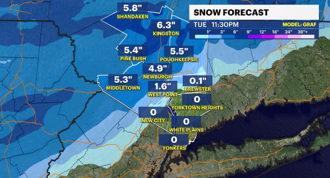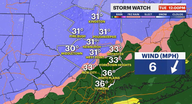 It will approach the region overnight tonight into Tuesday. Expect snow to start falling between 4-6 AM, starting in our western counties and then moving east. As the morning hours progress, temperatures will start to get milder. This will allow a change over to a wintry mix then rain for areas closer to the coast, such as Westchester, Rockland and Putnam Counties. Westchester will see cold rain fall through the midday to early afternoon hours. Rockland and Putnam Counties will see a mix of rain and snow come as temps will be in the low 30s. To the north and west is where all snow will fall down for Dutchess, Orange, Ulster & Sullivan Counties. Snow totals will be in the 3-6" range with some isolated 7" or more for Dutchess, Orange, Ulster & Sullivan Counties where a winter storm watch is in effect. A winter weather advisory is in effect for Rockland and Putnam Counties, where the lower totals and the mix of snow to rain will be expected. Westchester County is not under any alerts, at least not just yet, as the county will see the bulk of the precipitation fall as cold rain.