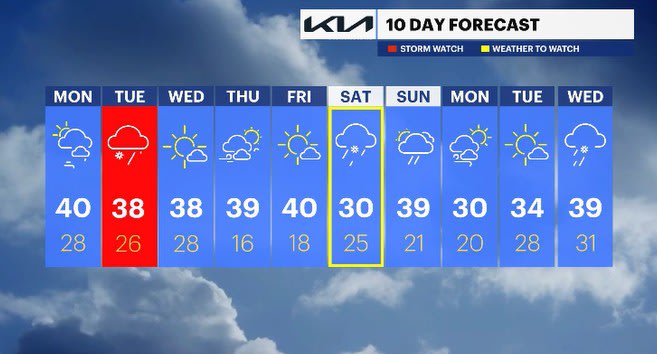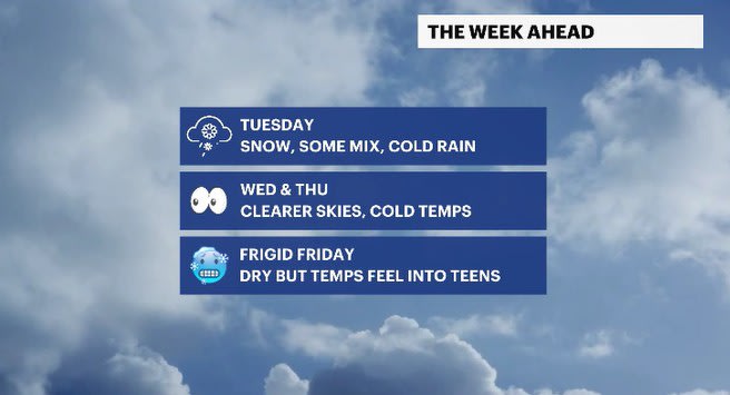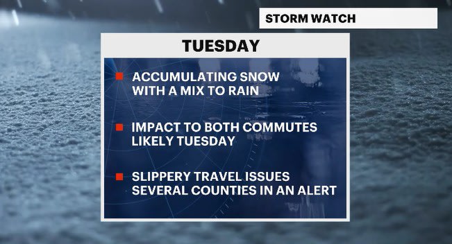 TUESDAY: STORM WATCH - Cloudy all day long with snow falling down at first for everyone, then a change to rain (with some mixing mixed in) for the midday hours. A change back to snow is possible for the afternoon ride home. Highs: mid-to-upper 30s. Lows: mid-20s.