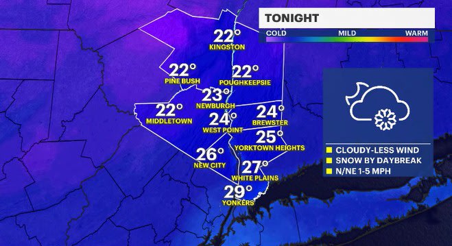 TONIGHT: Cloudy skies bring snow showers by daybreak. Lows: low to upper 20s.