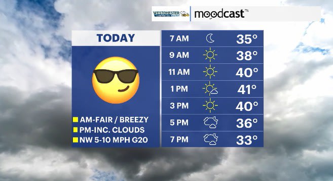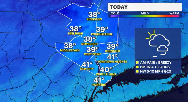 TODAY: DECEMBER 1st - Partly sunny and breezy, mainly during the first half of the day. Highs: upper 30s to low 40s.