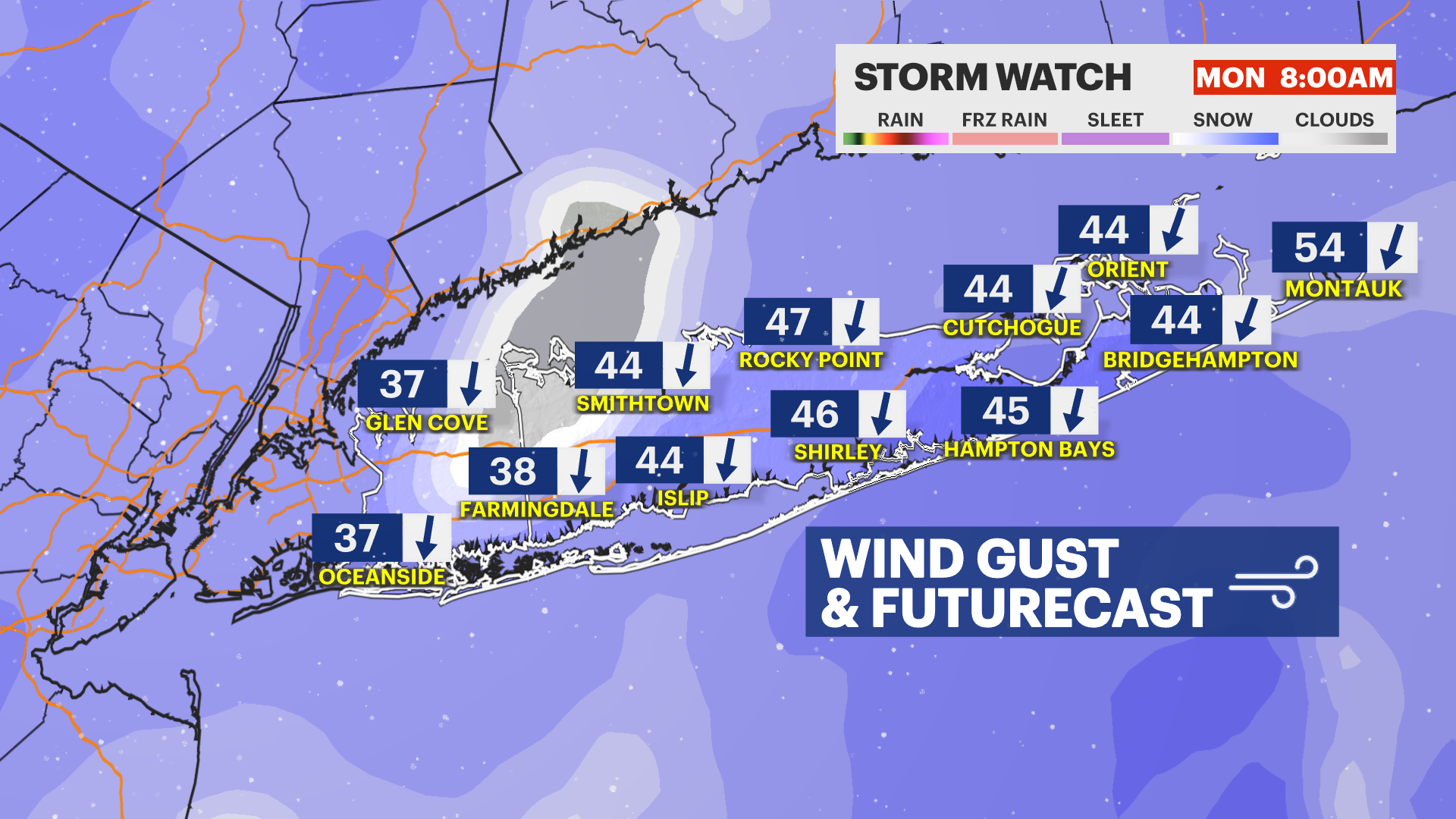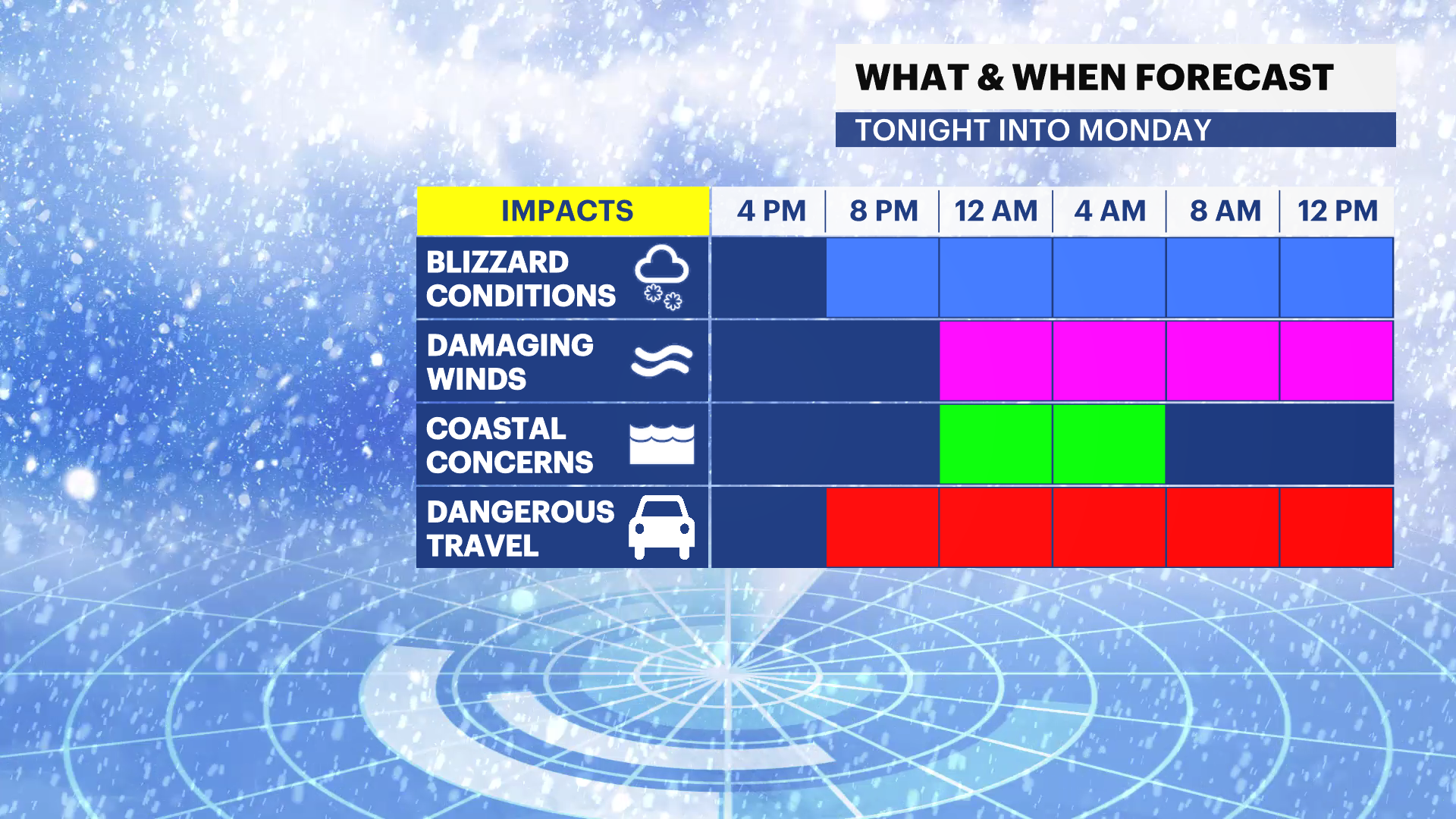 Visibility of less than a quarter of a mile, winds gusting up to 55 mph, some gusts over the East End could hit 70 mph and heavy blowing snow are expected to make travel near impossible and life threatening tonight through Monday morning.