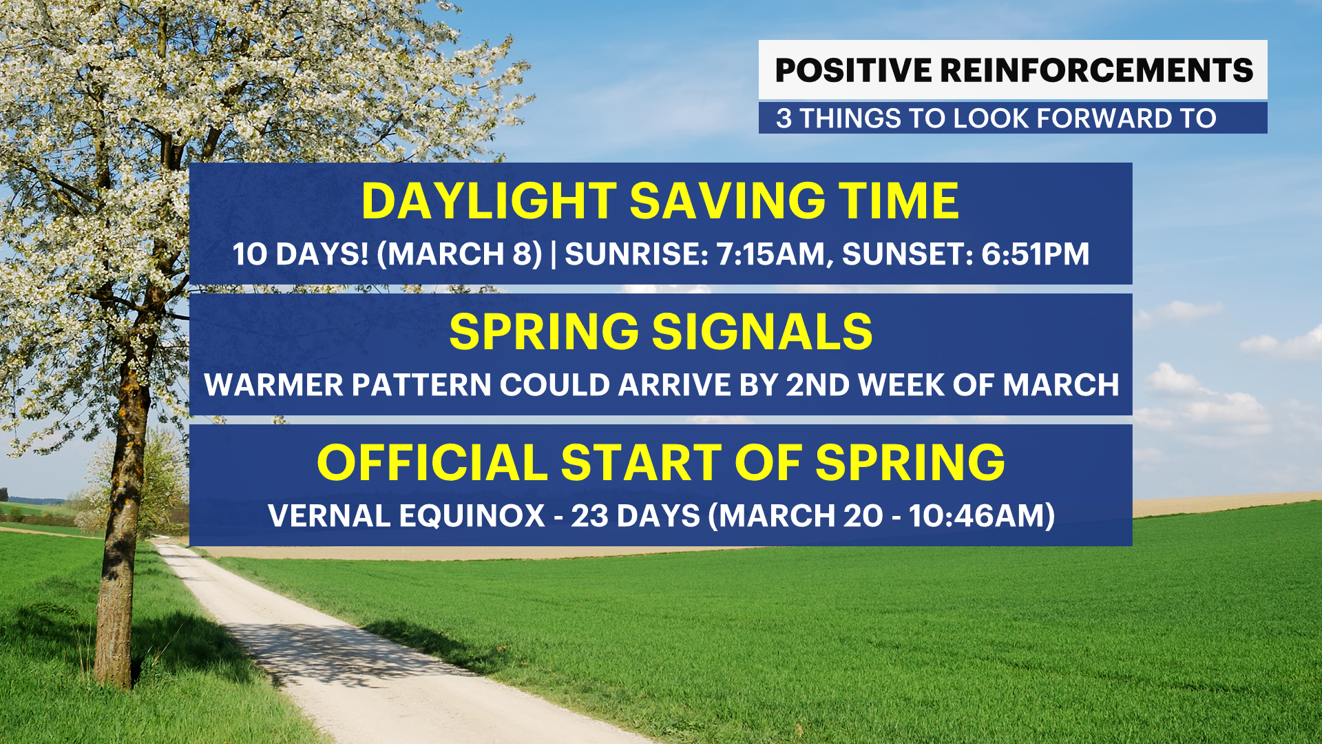 SUNDAY: Morning light snow. Another new coating to one inch of snow cannot be ruled out. Afternoon breaks of sunshine. Highs around 38 degrees. Lows near 18 degrees.