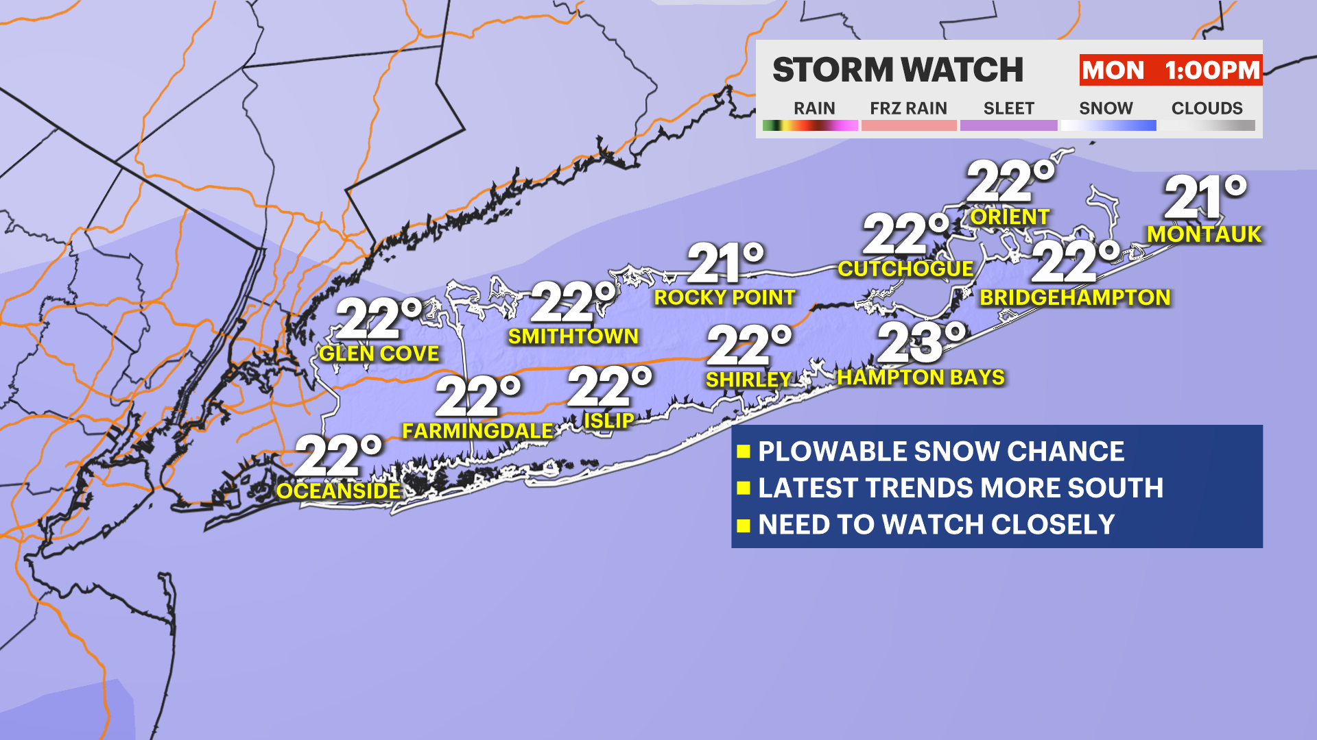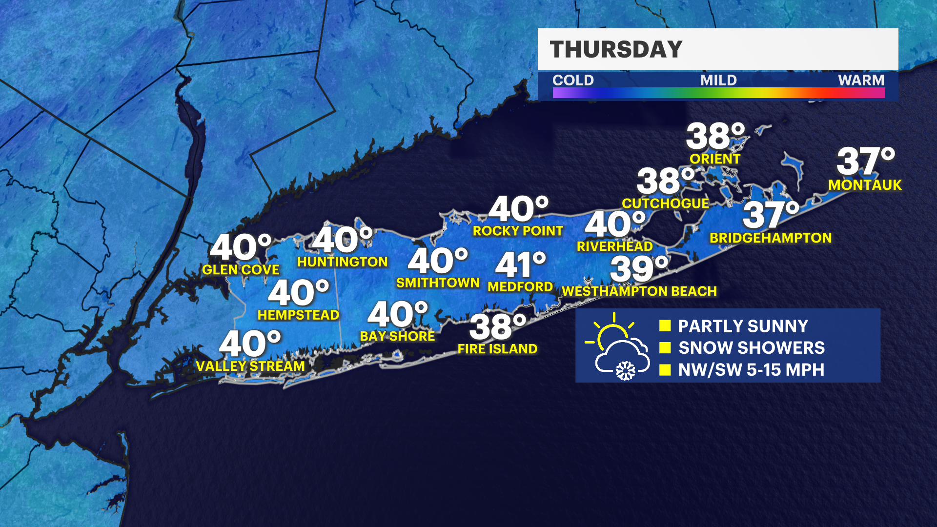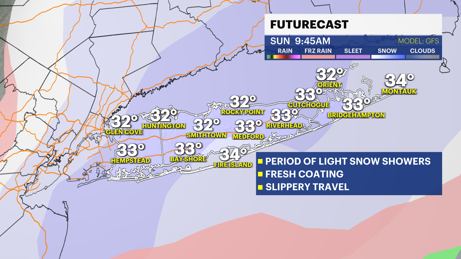 TODAY: While most of Long Island is likely to stay dry, a few spotty snow showers cannot be ruled out in the afternoon and evening. This could cause a spotty coating, but again - most of this snow is likely to remain south of Nassau and Suffolk Counties.