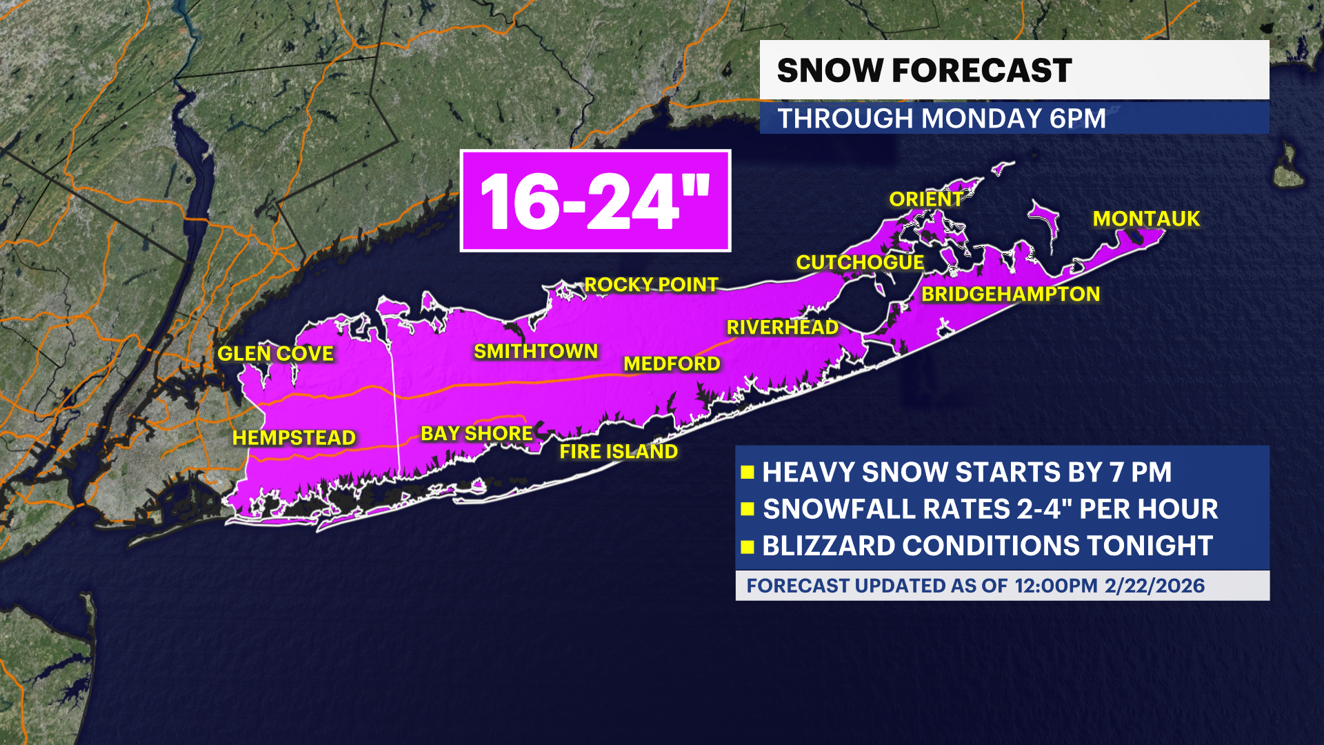 16-24 inches of snow is expected on Long Island as heavy bands of snow are anticipated to develop by 7 p.m. tonight through 6 a.m. Monday. Snowfall rates could be 2 to 4 inches per hour.