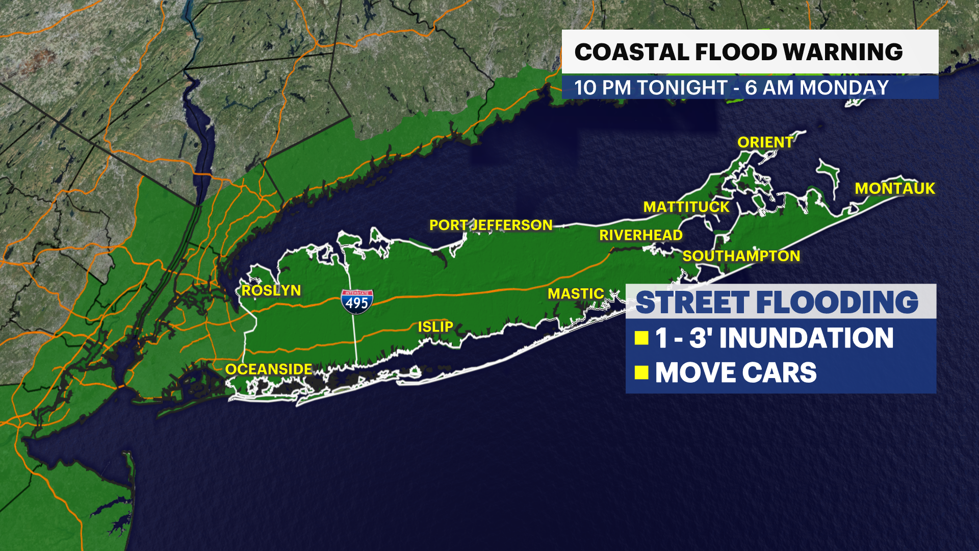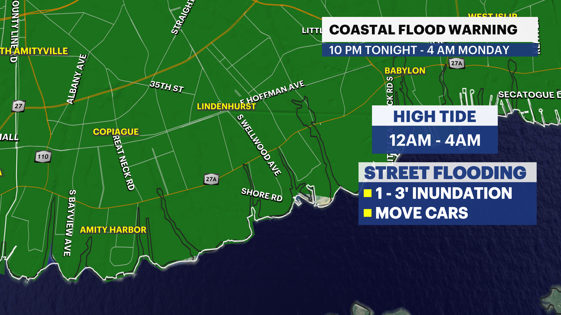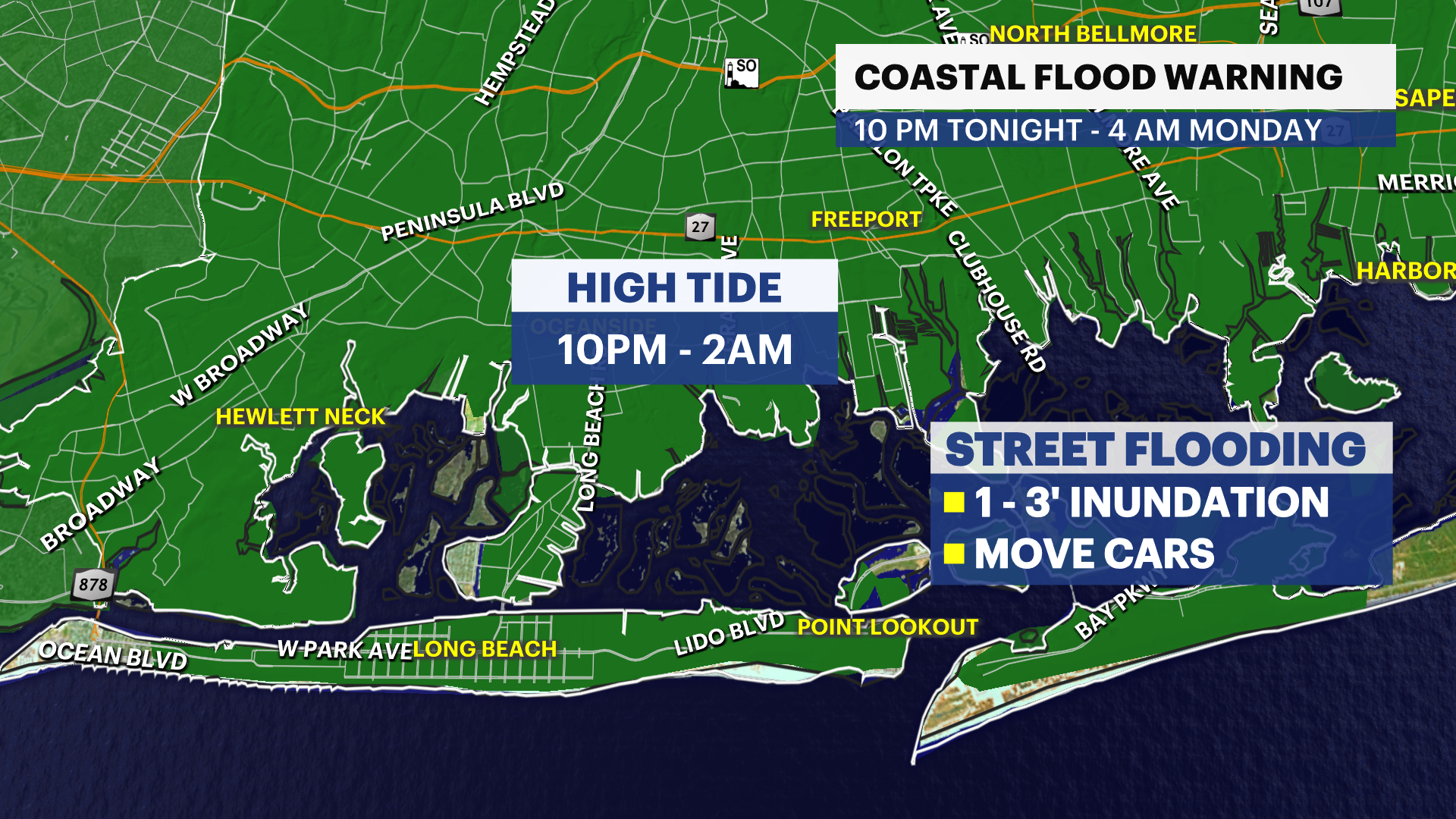 Coastal Flooding will be an issue with this storm during the high tide cycles between 10pm and 6am and 1pm to 6pm on Monday. 1-3 feet of inundation is possible. You will need to move your cars during high tide time.