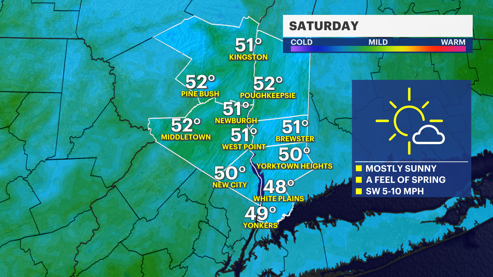 SATURDAY: Mostly sunny to partly cloudy. Highs around 44 degrees. Lows near 28 degrees.
