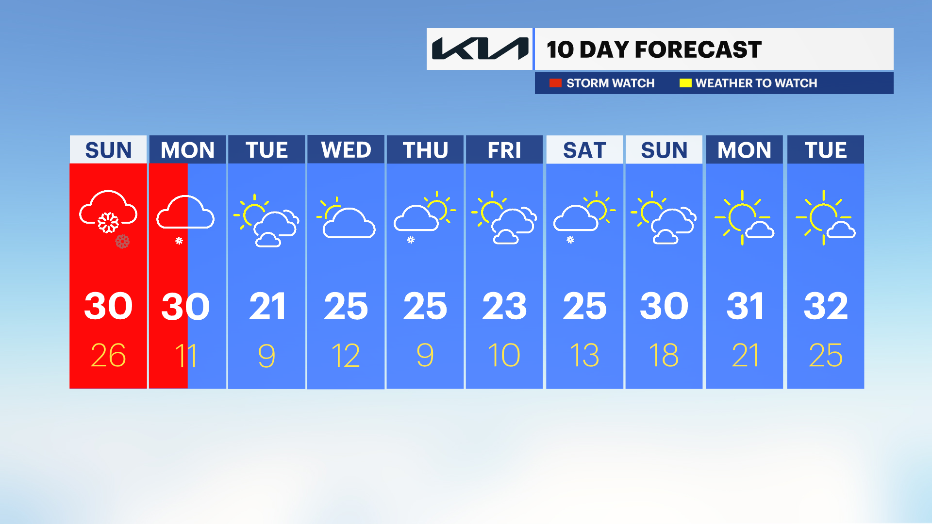Snow is likely to change to a period of sleet sometime after 4 p.m. Sunday. Plan for major travel impacts Sunday through next week. The snow and icy ground will not melt much at all through next week either with high temperatures stay well below freezing through all of next week.