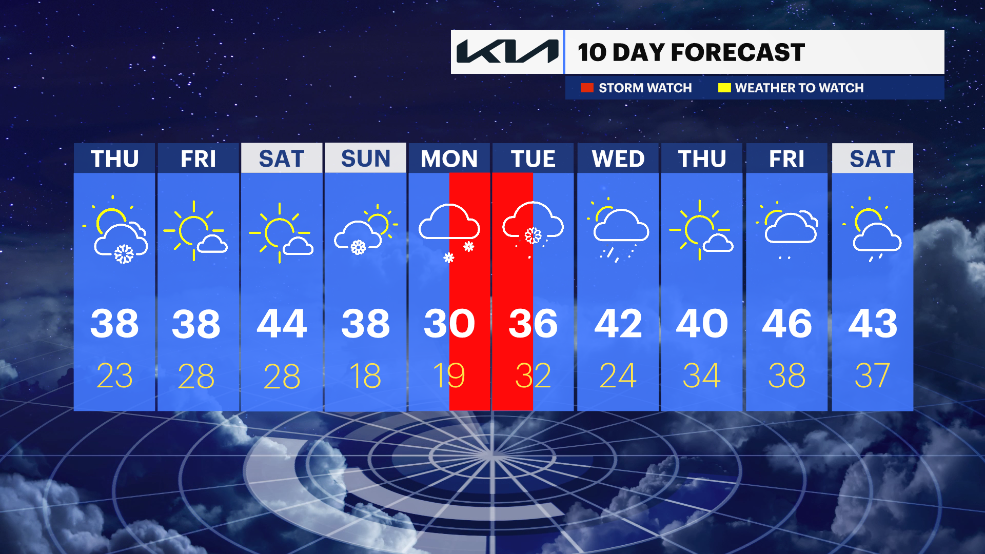 FRIDAY: Mostly sunny. Highs 37-40 degrees. Lows near 28 degrees.