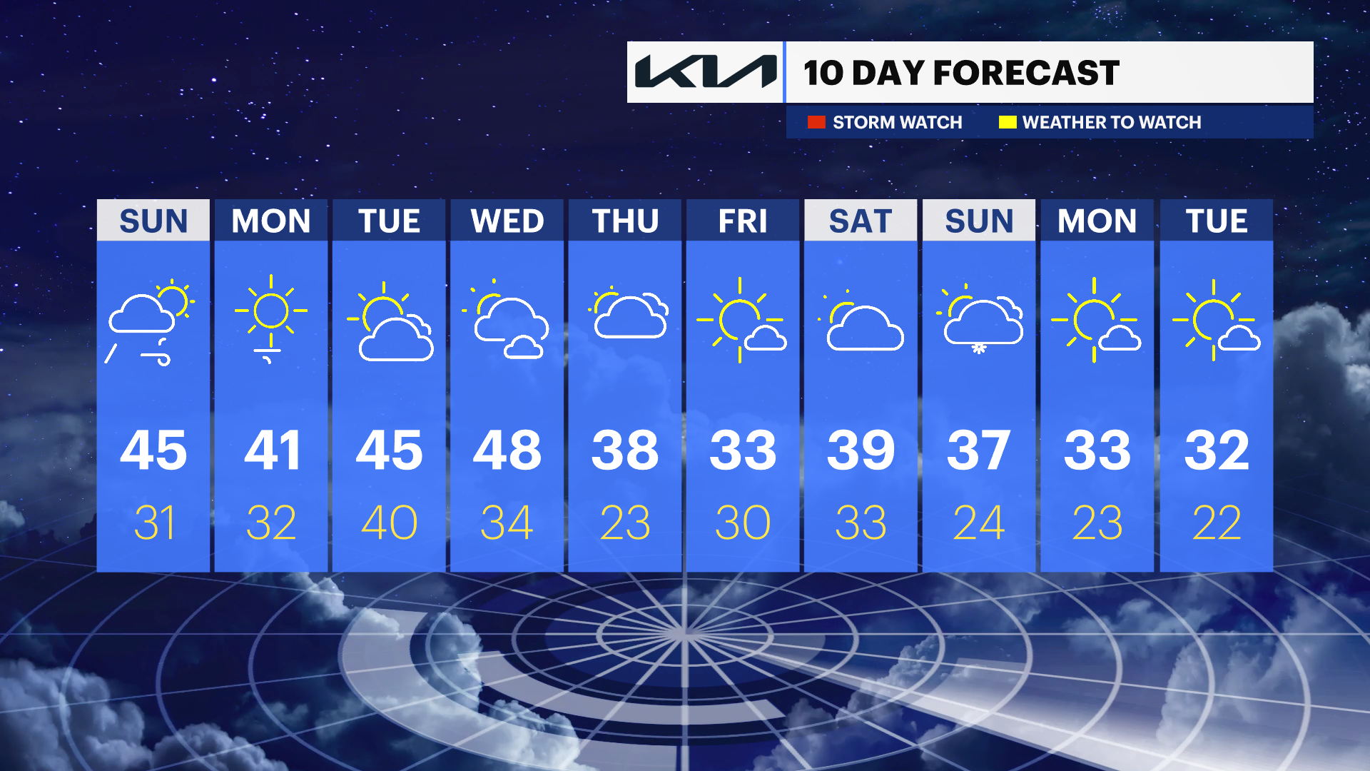 Monday will be mostly sunny with near normal temperatures in the lower to mid-40s.