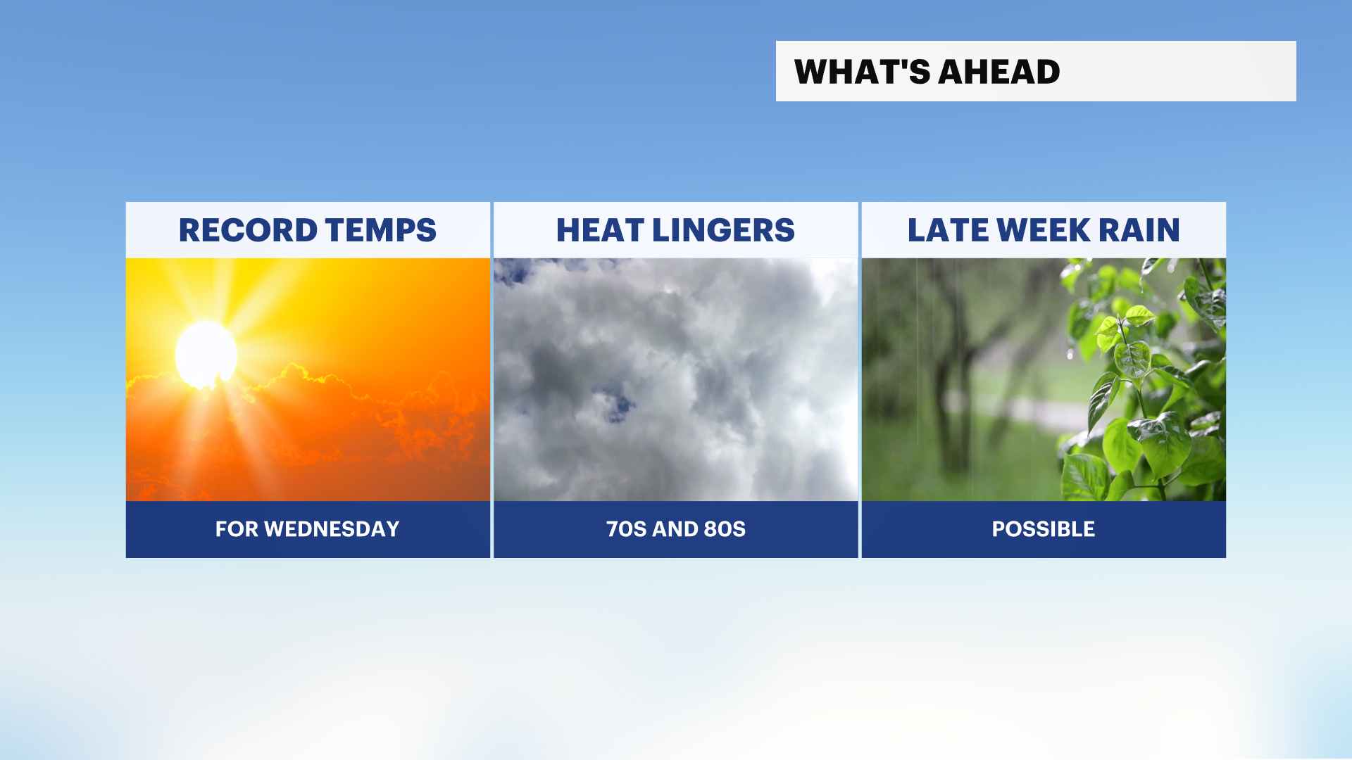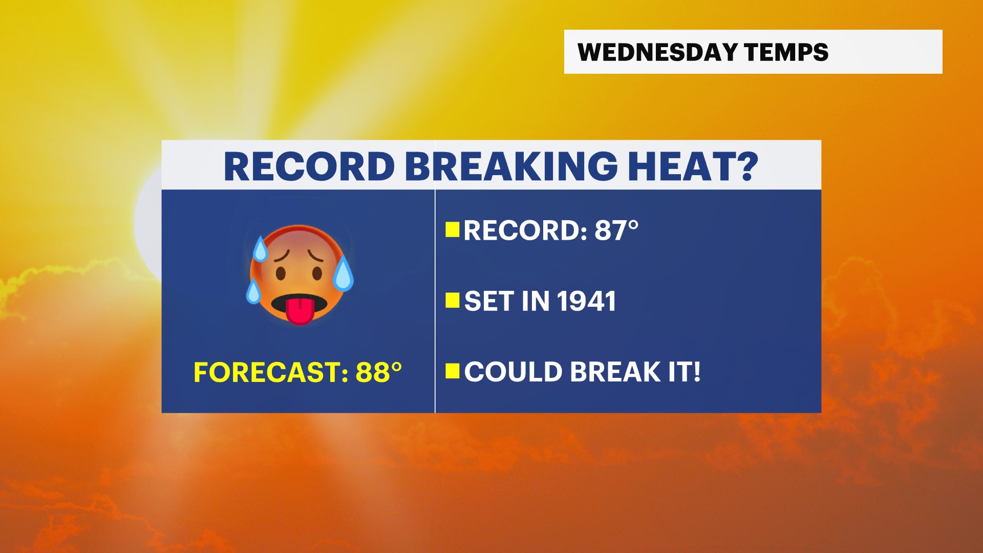 Record heat is likely on Wednesday with a forecast high temperature of 88 degrees. The record is 87 degrees setback in 1941. A passing shower or storm is possible after sunset on Wednesday. A front will move into the area on Friday bringing another chance of rain. Washout conditions are unlikely, but a quick downpour, thunder and lightning can cause a brief travel disruption during the afternoon. There's a better chance of storms North of the city. Stay tuned for updates.