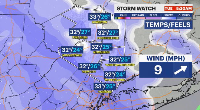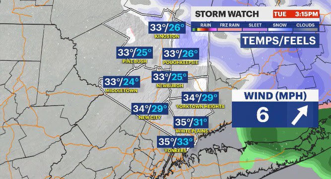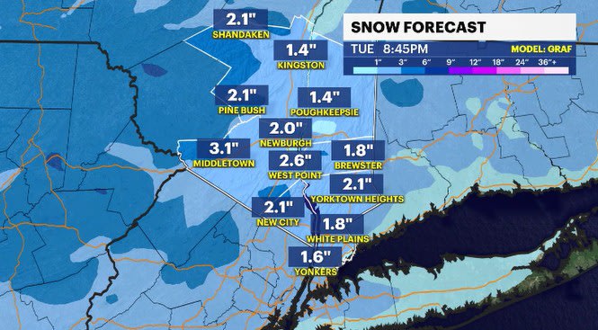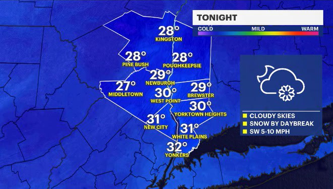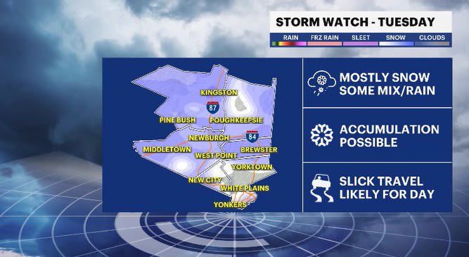 A storm system moves into the region overnight, bringing snow by daybreak for the Hudson Valley, which could make for slick travel conditions Tuesday morning.