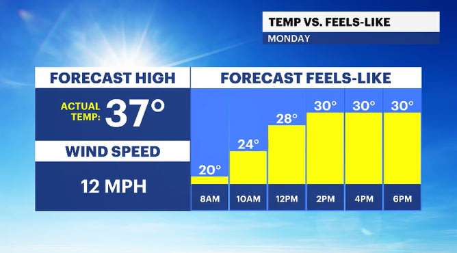 MONDAY: Sun and clouds with breezy winds. Highs: mid-30s. Lows: upper 10s to low 20s.
