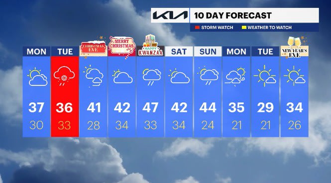 FRIDAY: KWANZAA - Mostly cloudy with a rain chance. Highs: mid-40s. Lows: low 30s.