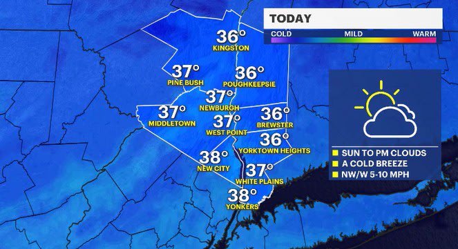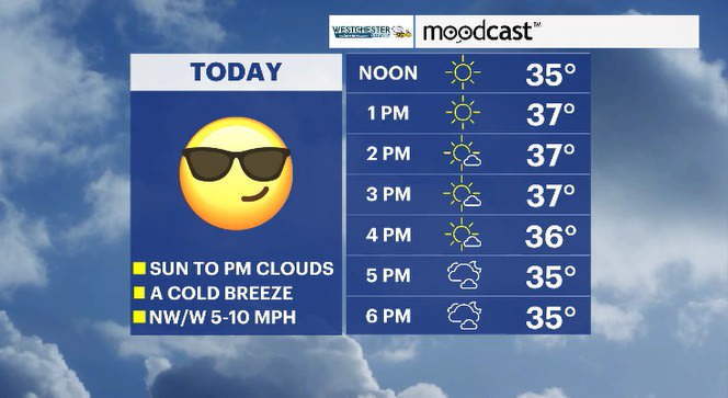 TODAY: Mostly sunny to mostly cloudy. Highs: mid-to-upper 30s.