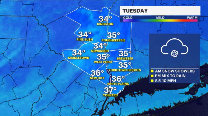 Expect snow showers into the midday hours with some areas closer to the city seeing a mix to rain coming in as temps slightly get milder through the day.