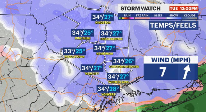 TUESDAY: STORM WATCH - Cloudy with snow showers at first, then a gradual warm up will change snow to a wintry mix and then rain. Highs: mid-30s. Lows: low 30s.