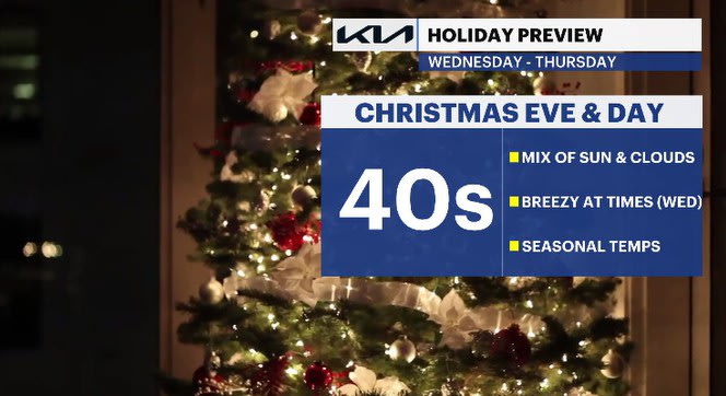 WEDNESDAY: CHRISTMAS EVE - Partly sunny and breezy. Highs: upper 30s to low 40s. Lows: upper 20s.