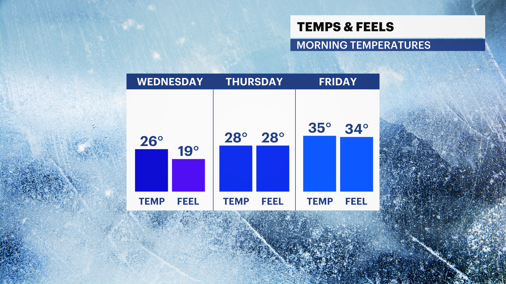 It will be a cold Wednesday overall. Temperatures in the afternoon won't rise out of the mid- and upper 30s. The winds will be lighter, but still enough to create a wind chill.