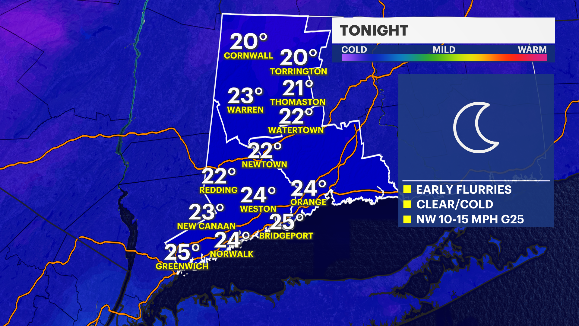 The winter chill settles in for tonight. As the winds fall off, so do temperatures. Look for lows to drop well below freezing and into the mid-20s.