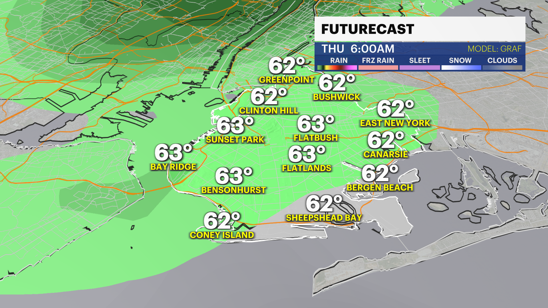 Thursday early: A strong weather system moves toward the city Thursday morning. Showers will be around for the morning drive. If you’re heading out bring rain gear and expect wet roads and slower travel. Temperatures will start the day on the mild side, in the 60s, but big changes will happen as the day unfolds.