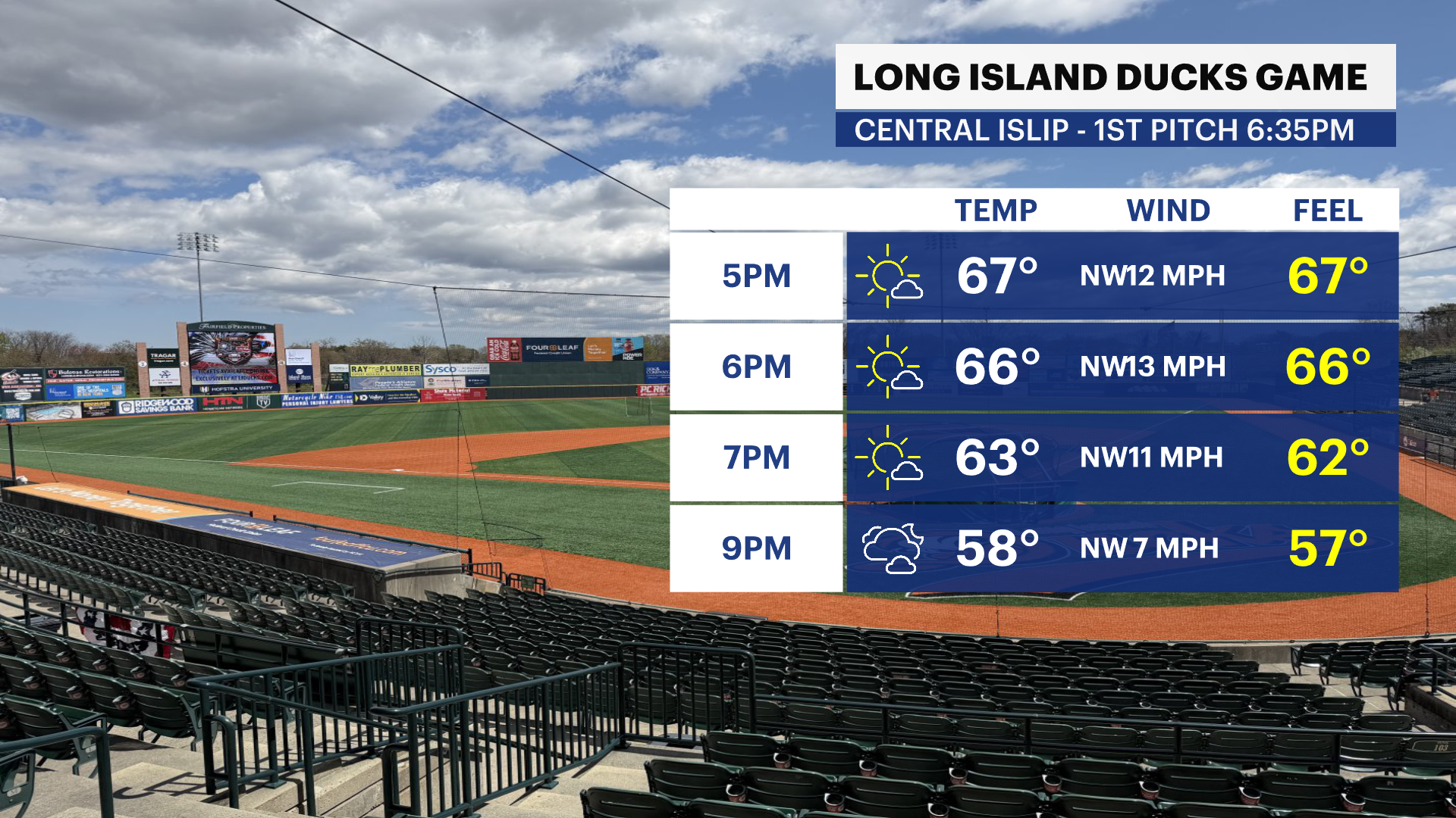 Thursday: Mostly sunny, with some passing clouds. Warmer. Highs near 68. West-Northwest wind 5 to 10 mph.