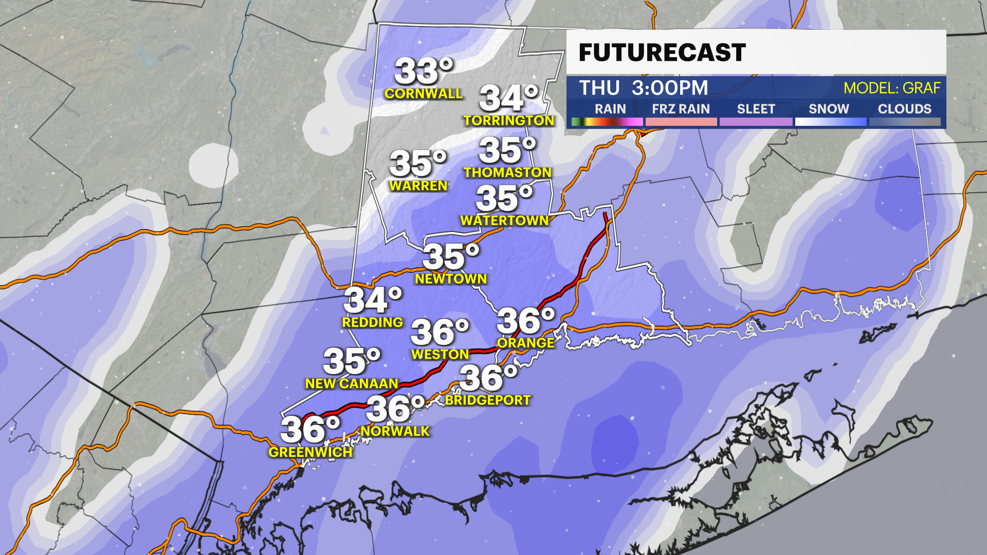 Thursday afternoon will be interesting. A blast of cold air drops temperatures into the 40s and upper 30s after lunchtime and any lingering precipitation will fall as sleet or snow. Temperatures should remain above freezing, but a coating of snow is possible.