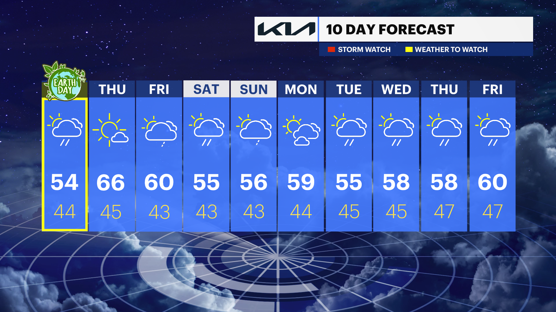 FRIDAY: Morning clouds and an isolated rain shower give way to more afternoon sunshine. Highs around 59 degrees. Lows near 44 degrees.