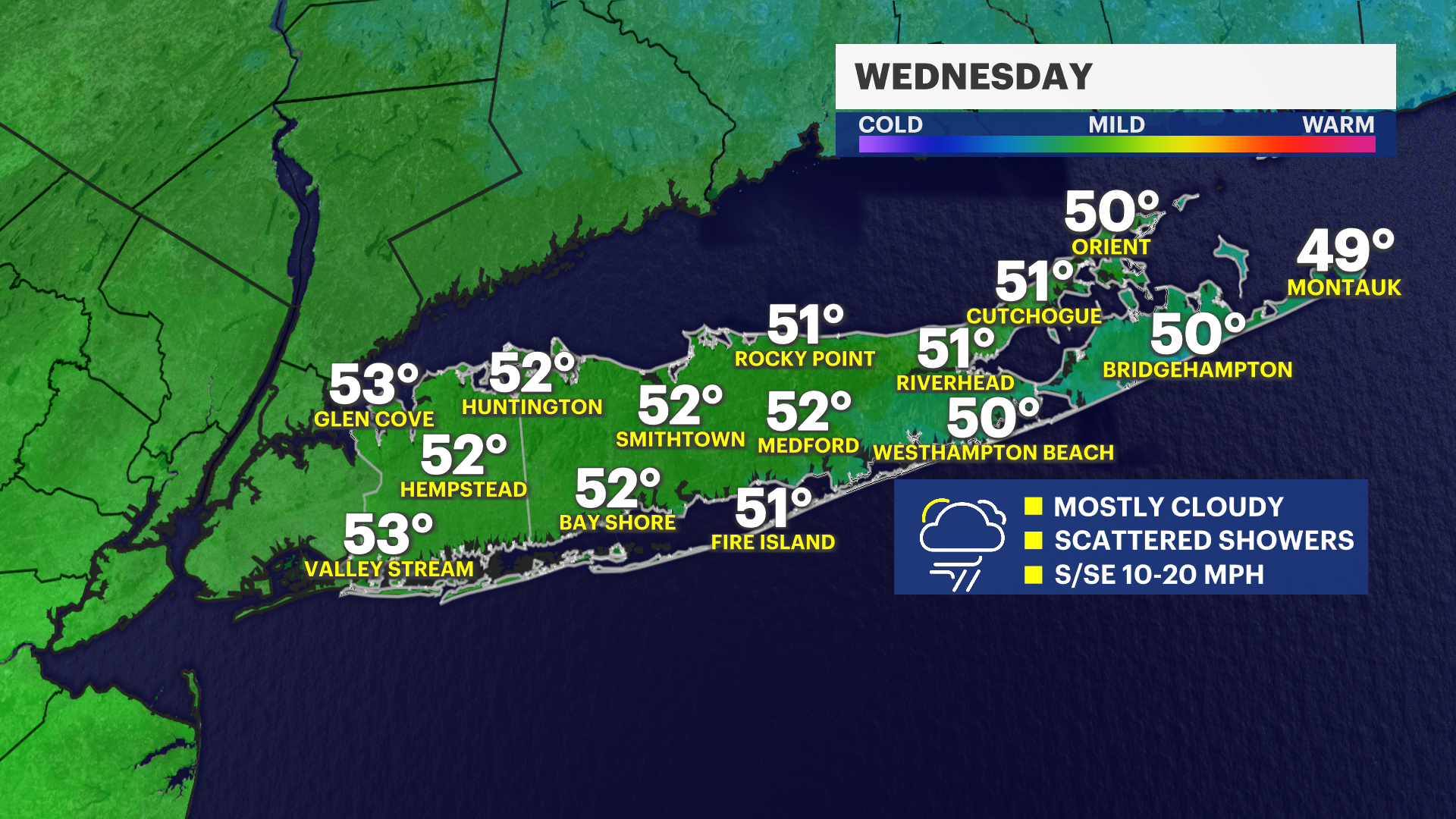 THURSDAY: PICK OF THE WEEK! Mostly sunny to a mix of sun and clouds. Much warmer. Highs around 68 degrees. It will be a bit cooler along the South Shore and East End and a bit warmer - in the lower 70s - in Nassau County. It becomes mostly cloudy by evening with lows near 47 degrees.